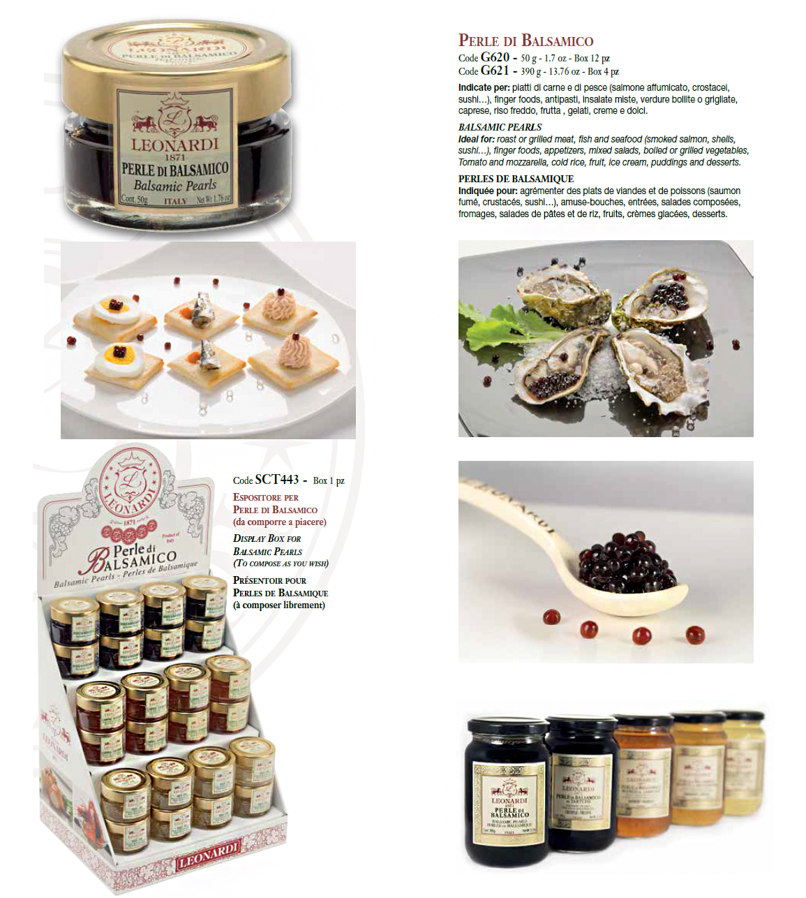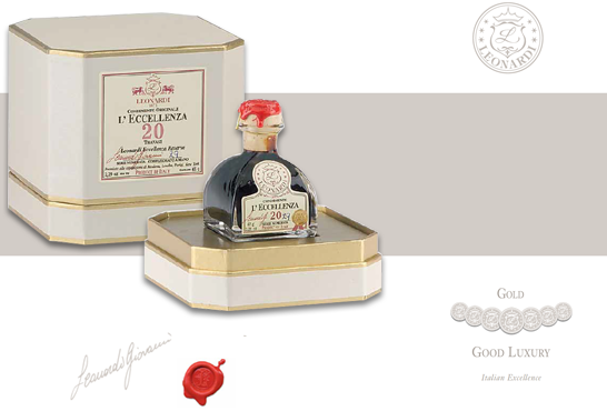 莱昂纳迪众多的产品中包括:指定产区DOP摩迪纳传统香醋,限定产区IGP摩迪纳传统香醋,香醋调料,白香醋,沙巴(烹过的葡萄汁),